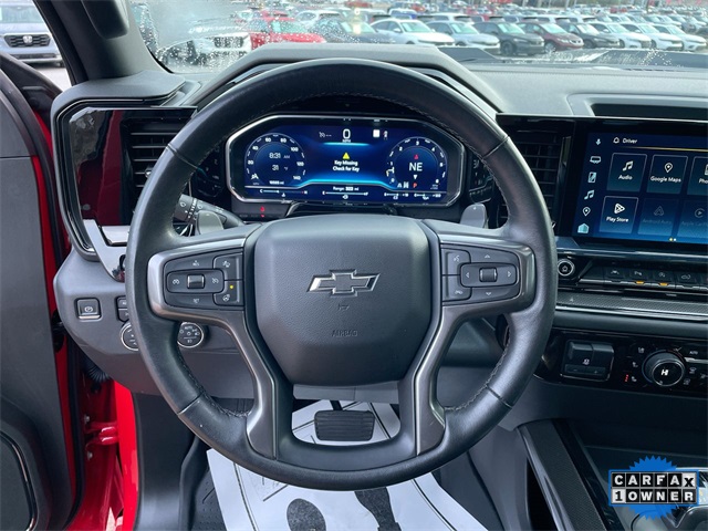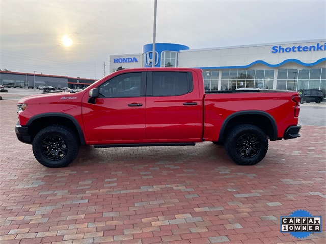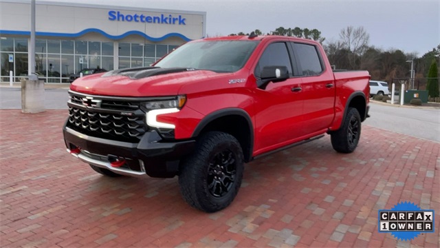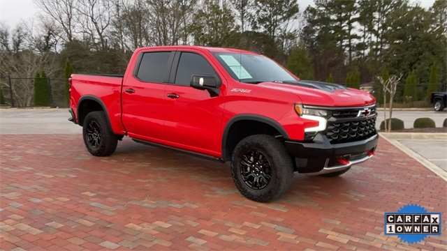 CARFAX One-Owner. 2022 Chevrolet Silverado 1500 ZR2 ZR2 Red Hot 4D Crew Cab EcoTec3 6.2L V8 10-Speed Automatic 4WD This vehicle comes well equipped with Preferred Equipment Group 3LT (10-Way Power Driver Seat w/Lumbar, 10-Way Power Passenger Seat Adjuster w/Lumbar, 12.3" Multicolor Reconfigurable Digital Display, 120-Volt Bed Mounted Power Outlet, 120-Volt Instrument Panel Power Outlet, 170 Amp Alternator, 2 USB Data Ports, 2nd Row Heated Outboard Seats, All-Weather Floor Liner (LPO), Auto-Dimming Inside Rear-View Mirror, Auto-Locking Rear Differential, Bed View Camera, Bluetooth® For Phone, Chevrolet Connected Access Capable, Chevytec Spray-On Black Bedliner, Color-Keyed Carpeting Floor Covering, Compass, Deep-Tinted Glass, Driver Memory, Dual Exhaust, Dual Rear USB Ports (Charge Only), Electric Rear-Window Defogger, Electrical Steering Column Lock, Electronic Cruise Control, EZ Lift Power Lock & Release Tailgate, Floor Mounted Center Console, Front LED Fog Lamps, Front Rainsensing Wipers, HD Surround Vision, Heated Driver & Front Outboard Passenger Seats, Heated Steering Wheel, Heavy-Duty Air Filter, High Gloss Black Mirror Caps, Hill Descent Control, Hitch Guidance w/Hitch View, Integrated Trailer Brake Controller, Keyless Open & Start, Leather Wrapped Steering Wheel, LED Cargo Area Lighting, Manual Tilt/Telescoping Steering Column, OnStar & Chevrolet Connected Services Capable, Outside Heated Power-Adjustable Mirrors, Performance Red Recovery Hooks, Perimeter Lighting, Power Front Passenger Windows w/Express Up/Down, Power Front Windows w/Driver Express Up/Down, Power Rear Windows w/Express Down, Power Sliding Rear Window w/Rear Defogger, Rear Cross Traffic Alert-Braking, Rear Park Assist, Rear Pedestrian Detection, Rear Wheelhouse Liners, Remote Vehicle Starter System, Safety Alert Seat, SiriusXM w/360L, Standard Tailgate, Steering Wheel Audio Controls, Theft Deterrent System (Unauthorized Entry), Trailer Camera Provisions, Trailer Side Blind Zone Alert, Trailering App, Universal Home Remote, Ventilated Driver & Front Passenger Seats, Wi-Fi Hot Spot Capable, Wireless Charging, and Wireless Phone Projection), Technology Package (15" Diagonal Multicolor Head-Up Display, Adaptive Cruise Control, Power Tilt & Telescoping Steering Column, and Rear Camera Mirror), Trailering Package (Hitch Guidance), Up-Level Rear Seat w/Storage Package, ZR2 Suspension Package, 3.23 Rear Axle Ratio, 4-Wheel Disc Brakes, 7 Speakers, ABS brakes, Air Conditioning, Alloy wheels, AM/FM radio: SiriusXM with 360L, Apple CarPlay/Android Auto, Auto High-beam Headlights, Auto-dimming door mirrors, Auto-dimming Rear-View mirror, Automatic Emergency Braking, Automatic temperature control, Brake assist, Delay-off headlights, Driver door bin, Driver vanity mirror, Dual front impact airbags, Dual front side impact airbags, Electronic Stability Control, Electronic Transmission Range Selector Shifter, Following Distance Indicator, Forward Collision Alert, Front anti-roll bar, Front Bucket Seats, Front Center Armrest, Front dual zone A/C, Front fog lights, Front Pedestrian Braking, Front reading lights, Front wheel independent suspension, Fully automatic headlights, Garage door transmitter, Heated door mirrors, Heated front seats, Heated rear seats, Heated steering wheel, Illuminated entry, IntelliBeam Automatic High Beam On/Off, Lane Keep Assist w/Lane Departure Warning, Low tire pressure warning, Memory seat, Multi-Flex Tailgate, Not Equipped w/Steering Column Lock, Occupant sensing airbag, Outside temperature display, Overhead airbag, Overhead console, Panic alarm, Passenger door bin, Passenger vanity mirror, Perforated Leather Seat Trim, Power door mirrors, Power driver seat, Power passenger seat, Power steering, Power Sunroof, Power windows, Premium audio system: Chevrolet Infotainment 3 Premium, Premium Bose 7-Speaker Sound System, Radio data system, Radio: Chevrolet Infotainment 3 Premium System, Rain sensing wipers, Rear reading lights, Rear seat center