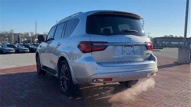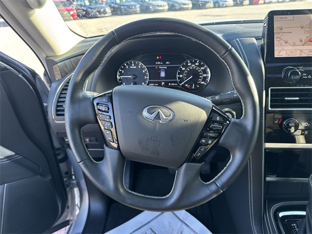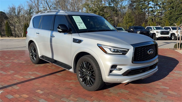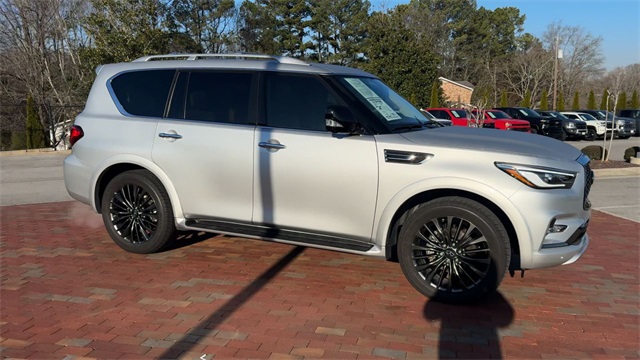 CARFAX One-Owner. 2023 INFINITI QX80 Premium Select Premium Select Liquid Platinum 4D Sport Utility 5.6L V8 7-Speed Automatic RWD This vehicle comes well equipped with Cargo Package (Cargo Net, Carpeted Cargo Mat, Center Console Tray, Console Net, and First-Aid Kit), 13 Speakers, 2.937 Axle Ratio, 3rd row seats: split-bench, 4-Wheel Disc Brakes, ABS brakes, Air Conditioning, Alloy wheels, AM/FM radio: SiriusXM, Anti-whiplash front head restraints, Auto High-beam Headlights, Auto tilt-away steering wheel, Auto-dimming door mirrors, Auto-dimming Rear-View mirror, Auto-leveling suspension, Automatic temperature control, Brake assist, Bumpers: body-color, Compass, Delay-off headlights, Driver door bin, Driver vanity mirror, Dual front impact airbags, Dual front side impact airbags, Electronic Stability Control, Emergency communication system: INFINITI InTouch, Four wheel independent suspension, Front anti-roll bar, Front Bucket Seats, Front Center Armrest, Front dual zone A/C, Front fog lights, Front reading lights, Fully automatic headlights, Garage door transmitter: HomeLink, Heated door mirrors, Heated Front Bucket Seats, Heated front seats, Heated steering wheel, Illuminated entry, INFINITI Radiant Illuminated Kick Plates, Leather Shift Knob, Leather steering wheel, Leather-Appointed Seats, Literature Kit, Low tire pressure warning, Memory seat, Navigation system: INFINITI InTouch Navigation, Occupant sensing airbag, Outside temperature display, Overhead airbag, Overhead console, Panic alarm, Passenger door bin, Passenger vanity mirror, Power door mirrors, Power driver seat, Power Liftgate, Power moonroof, Power passenger seat, Power steering, Power windows, Premium audio system: Bose, Premium Select Sahara Stone Interior, Radio data system, Radio: Bose Premium Audio System w/13 Speakers, Rain sensing wipers, Rear air conditioning, Rear anti-roll bar, Rear reading lights, Rear seat center armrest, Rear window defroster, Rear window wiper, Reclining 3rd row seat, Remote keyless entry, Roof Rail Cross Bars, Security system, Speed control, Speed-sensing steering, Split folding rear seat, Spoiler, Steering wheel memory, Steering wheel mounted audio controls, Tachometer, Telescoping steering wheel, Tilt steering wheel, Traction control, Trip computer, Turn signal indicator mirrors, Variably intermittent wipers, Voltmeter, and Wheels: 22" x 8.0" Dark Chrome Cast Aluminum-Alloy.