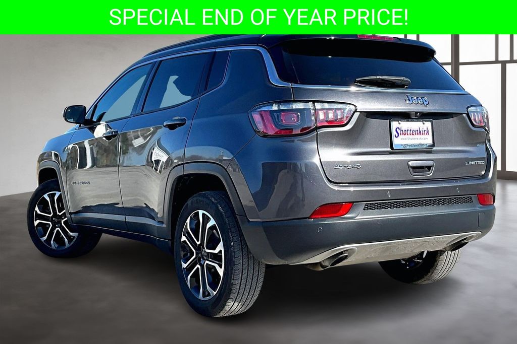 Apple CarPlay, Android Auto, Back Up Camera, Heated Seats, Leather Interior, Power Drivers Seat, Compass Limited, 2.0L I4 DOHC, 8-Speed Automatic, 4WD, Granite Crystal Metallic Clearcoat, Black Leather, 10.1" Touchscreen Display, AM/FM radio: SiriusXM, Auto-dimming Rear-View mirror, Automatic temperature control, Electronic Stability Control, Front dual zone A/C, Front fog lights, Fully automatic headlights, Heated door mirrors, Heated front seats, Heated steering wheel, Leatherette Seats, Outside temperature display, ParkView Rear Back-Up Camera, Power door mirrors, Power driver seat, Quick Order Package 29G, Radio: Uconnect 5 w/10.1" Display, Rain sensing wipers, Remote keyless entry, Spoiler, Telescoping steering wheel, Tilt steering wheel, Turn signal indicator mirrors.