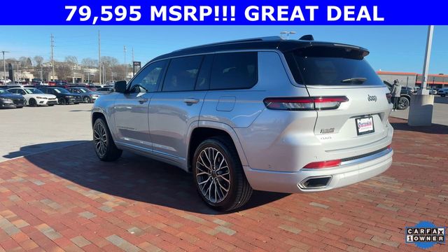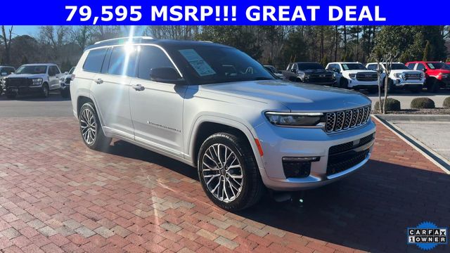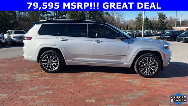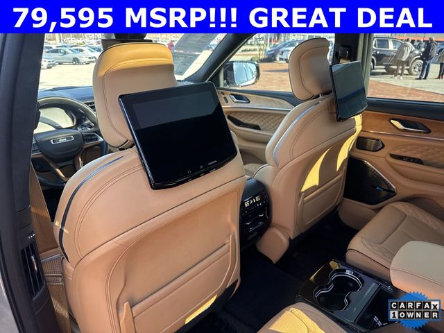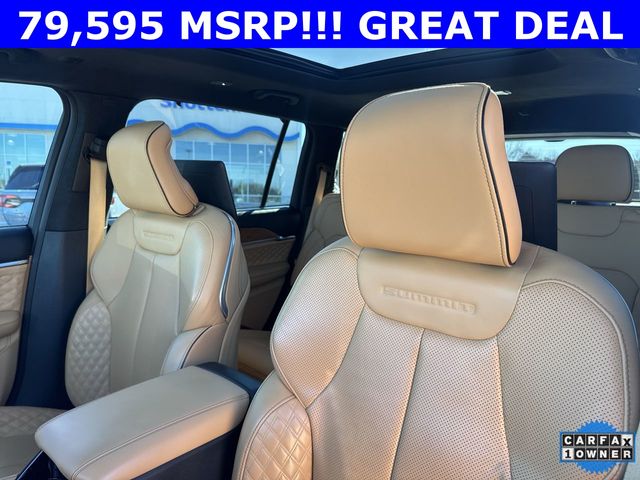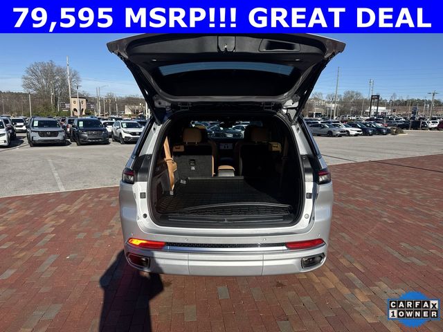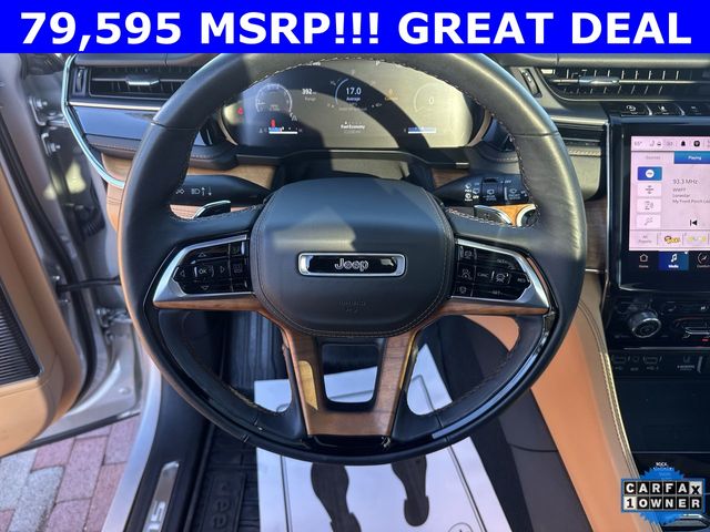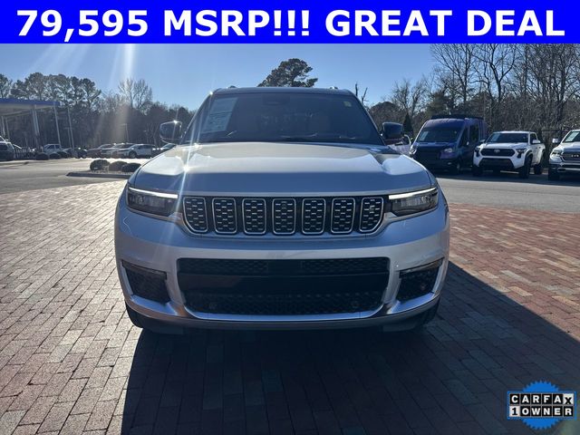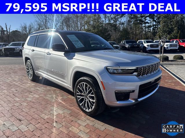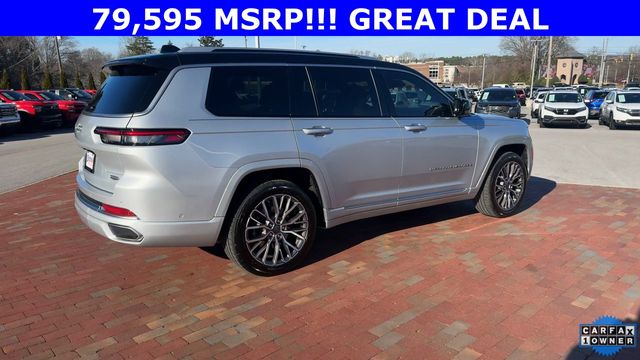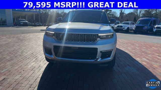 CARFAX One-Owner. 2024 Jeep Grand Cherokee L Summit Summit Silver Zynith 4D Sport Utility 3.6L V6 24V VVT 8-Speed Automatic 4WD This vehicle comes well equipped with Advanced Protech Group IV (Heads-Up Display, Interior Rear Facing Camera, Night Vision/Pedestrian-Animal Detection, and Rearview Autodim Digital Display Mirror), Luxury Tech Group V (2nd Row Manual Window Shades and Wireless Charging Pad), Quick Order Package 23U Summit Reserve (19 Speakers High Performance Audio, 950 Watt Amplifier, Active Noise Control System, Deluxe Headliner, Front Passenger Interactive Display, Palermo Leather Door Trim, Palermo Leather Seats, Summit Reserve, Summit Reserve Badge, Ventilated Rear Seats, and Wheels: 21" x 9.0" Machined Face/Painted Aluminum), Rear Seat Video Group I (Amazon Fire TV Built-In, Seatback Video Screens, and Video USB Port), Two Tone Paint Group, 10 Speakers, 3.45 Rear Axle Ratio, 3rd row seats: split-bench, 4-Wheel Disc Brakes, ABS brakes, Adaptive suspension, Air Conditioning, Alloy wheels, AM/FM radio: SiriusXM with 360L, Anti-whiplash front head restraints, Audio memory, Auto High-beam Headlights, Auto-dimming door mirrors, Auto-dimming Rear-View mirror, Auto-leveling suspension, Automatic temperature control, Brake assist, Bumpers: body-color, Compass, Delay-off headlights, Driver door bin, Driver vanity mirror, Dual front impact airbags, Dual front side impact airbags, Electronic Stability Control, Emergency communication system, Four wheel independent suspension, Front anti-roll bar, Front Bucket Seats, Front Center Armrest w/Storage, Front dual zone A/C, Front fog lights, Front reading lights, Fully automatic headlights, Garage door transmitter, Genuine wood dashboard insert, Genuine wood door panel insert, Heated door mirrors, Heated front seats, Heated rear seats, Heated steering wheel, Illuminated entry, Knee airbag, Leather steering wheel, Low tire pressure warning, Memory seat, Nappa Leather Seats, Navigation System, Normal Duty Suspension, Occupant sensing airbag, Outside temperature display, Overhead airbag, Overhead console, Panic alarm, Passenger door bin, Passenger vanity mirror, Power door mirrors, Power driver seat, Power Fold Seatbacks, Power Liftgate, Power moonroof, Power passenger seat, Power steering, Power windows, Radio data system, Radio: Uconnect 5 Nav w/10.1" Display, Rain sensing wipers, Rear air conditioning, Rear anti-roll bar, Rear dual zone A/C, Rear reading lights, Rear seat center armrest, Rear window defroster, Rear window wiper, Reclining 3rd row seat, Remote keyless entry, Security system, Speed control, Speed-Sensitive Wipers, Split folding rear seat, Spoiler, Steering wheel memory, Steering wheel mounted audio controls, Tachometer, Telescoping steering wheel, Tilt steering wheel, Traction control, Trip computer, Turn signal indicator mirrors, Variably intermittent wipers, Ventilated front seats, Voltmeter, and Wheels: 20" x 8.5" Fully Painted Aluminum Silver.