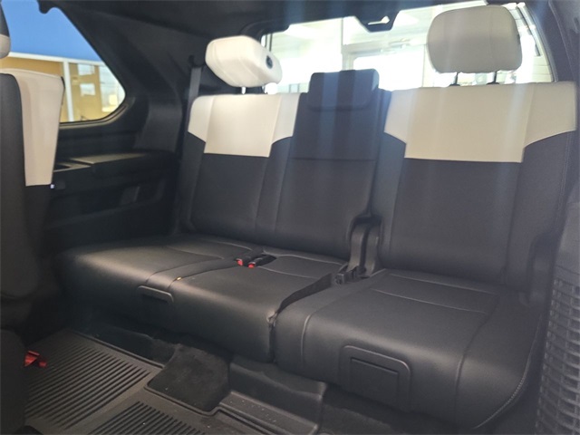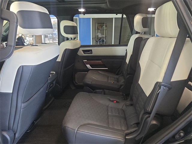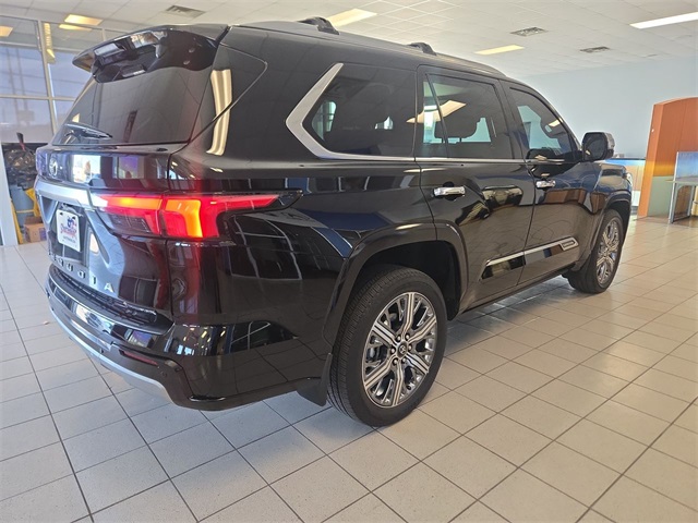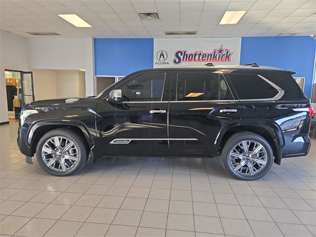 Midnight Black Metallic 2025 Toyota Sequoia Capstone 4WD 10-Speed Automatic V6 Hybrid 14 Speakers, 3rd row seats: split-bench, 4-Wheel Disc Brakes, ABS brakes, Active Cruise Control, Air Conditioning, Alloy wheels, AM/FM radio: SiriusXM, Anti-whiplash front head restraints, Apple CarPlay/Android Auto, Auto High-beam Headlights, Auto tilt-away steering wheel, Auto-dimming door mirrors, Auto-dimming Rear-View mirror, Automatic temperature control, Brake assist, Bumpers: body-color, Compass, Delay-off headlights, Driver door bin, Driver vanity mirror, Dual front impact airbags, Dual front side impact airbags, Electronic Stability Control, Emergency communication system: Safety Connect (10-year trial), Exterior Parking Camera Rear, Front anti-roll bar, Front Bucket Seats, Front Center Armrest w/Storage, Front dual zone A/C, Front fog lights, Front reading lights, Front wheel independent suspension, Fully automatic headlights, Garage door transmitter: HomeLink, Genuine wood door panel insert, Headlight cleaning, Heads-Up Display, Heated & Ventilated Front Seats, Heated door mirrors, Heated front seats, Heated rear seats, Heated steering wheel, Illuminated entry, Knee airbag, Leather Shift Knob, Leather steering wheel, Low tire pressure warning, Memory seat, Navigation System, Navigation system: Drive Connect (1 year trial) includes Cloud Navigation with real time traffic and Google POI, Occupant sensing airbag, Outside temperature display, Overhead airbag, Overhead console, Panic alarm, Passenger door bin, Passenger vanity mirror, Power door mirrors, Power driver seat, Power Liftgate, Power moonroof, Power passenger seat, Power steering, Power windows, Premium audio system: JBL, Radio: 14" Toyota Audio Multimedia w/JBL Prem Aud, Rain sensing wipers, Rear air conditioning, Rear reading lights, Rear seat center armrest, Rear window defroster, Rear window wiper, Reclining 3rd row seat, Remote keyless entry, Security system, Semi-Aniline Leather Seat Trim, Speed control, Speed-sensing steering, Split folding rear seat, Spoiler, Sport steering wheel, Steering wheel mounted audio controls, Tachometer, Telescoping steering wheel, Tilt steering wheel, Traction control, Trip computer, Turn signal indicator mirrors, Variably intermittent wipers, Ventilated front seats, Ventilated rear seats, Voltmeter, Wheels: 22" Dark Chrome Machined-Finish Alloy.
